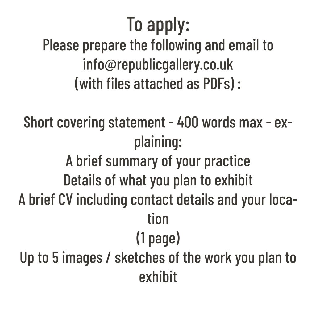 To submit your application please email us at info@republicgallery.co.uk