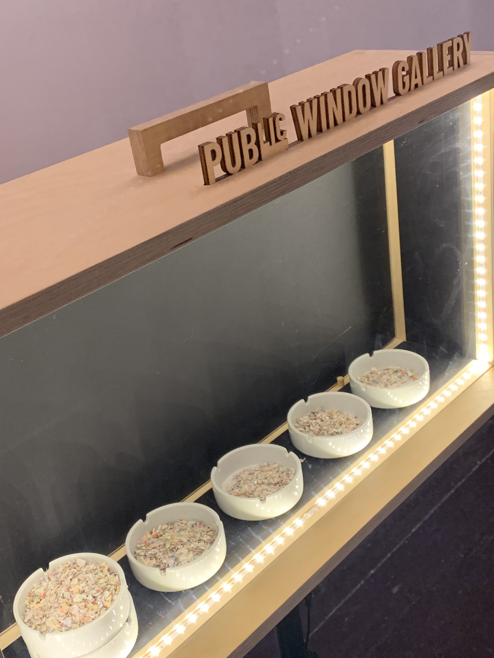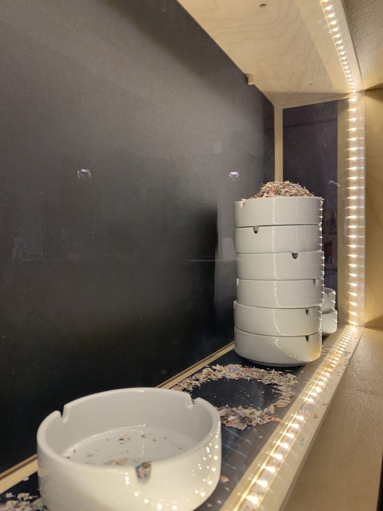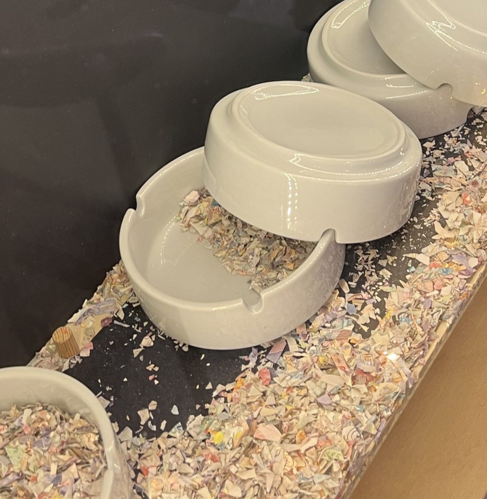 Installation comprises:- 10cm Diameter White Porcelain Ashtrays. Pre-Polymer New Elizabethan Shredded Sterling Bank Notes.£50, £20, £10 & £5 notes. (£50,000 – £20,0000)