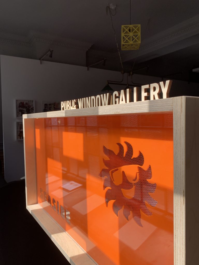 Matthew’s PUBlic Window installation will be on display until the 18th February. ‘Whilst I live I’ll Crow’ works with the playful seaside imagery he has collected as part of a larger and ongoing project. The laser cut sun and ‘seaside’ text act as a peephole to a halftone costal scene behind. The work will shift from day to night once it is illuminated, providing a much-needed reminder of sun during a dark cold January.