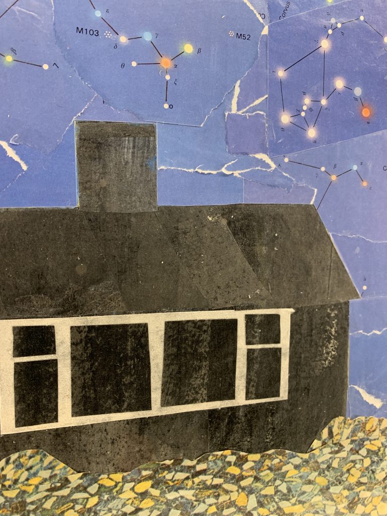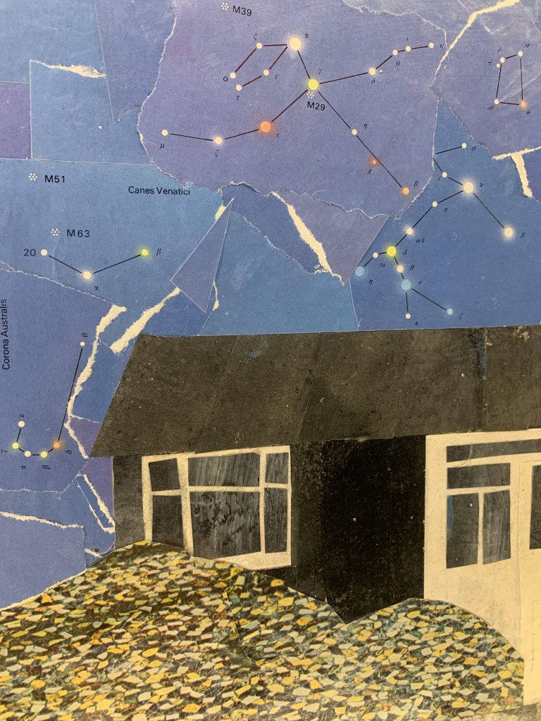 ‘Prominent Objects’ is a collage based on a small one-storey home she passes often. The house – removed from its street, neighbourhood, town – is exposed to eternity. The comfort blankets between our immediate shelters and the further reaches of our universe have been stripped.